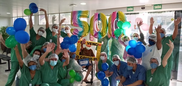 Três balões com o número 500 foram expostos junto ao paciente ilustre com a festa dos colaboradores. Karine explica que a alegria foi ainda maior porque essa alta exigiu esforço concentrado dos profissionais. “Esse é um paciente que ficou 10 dias internado na UTI e que necessitou de atenção integral como damos a todos os pacientes aqui. Assim é uma alegria ainda maior porque isso é patente quanto a qualificação profissional de médicos, enfermeiros, técnicos, fisioterapeutas, fonoaudiólogos e todos os profissionais de apoio. Ver um paciente que esteve na UTI sair rindo, conversando e brincando com as equipes é um fato muito gratificante para todos”.