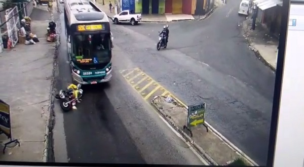 Motociclista tenta passar coletivo pela direita, perde o controle da moto e cai na frente do veículo