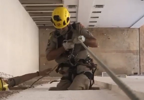 Os bombeiros utilizaram técnicas de salvamento de rapel em altura para retirar a criança de dentro do banheiro, que foi entregue à mãe sem ferimentos.