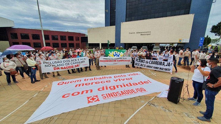 Servidores da Prefeitura de Goiânia protestam em frente ao Paço Municipal nesta quinta-feira (18). Agentes de Saúde e de Endemias cobram a inclusão das categorias no Plano de Carreira da Saúde.