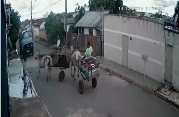 O acidente foi na rua Francisco de Queiroz, no bairro Paranaíba. As imagens mostram o momento exato em que a carroça conduzida pelo entregador de leite fazia uma conversão no meio da rua quando foi atingida na traseira pela segunda carroça que seguia em linha reta.