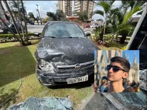 Veículo GM Corsa bate na portaria de prédio e mata o estudante Bruno Marques (no detalhe) - (Foto Reprodução Redes Sociais)