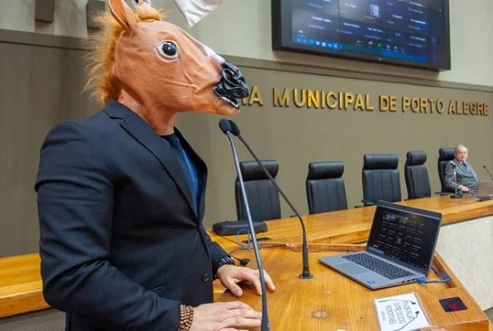 Início Política VÍDEO: Vereador usa máscara de cavalo durante sessão para criticar homenagem