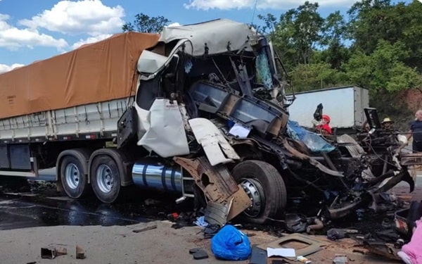 De acordo com a Polícia Rodoviária Federal (PRF), uma carreta atingiu a traseira da outra, causando um grande impacto e matando na hora o motorista e o passageiro do caminhão que teve a cabine destruída.