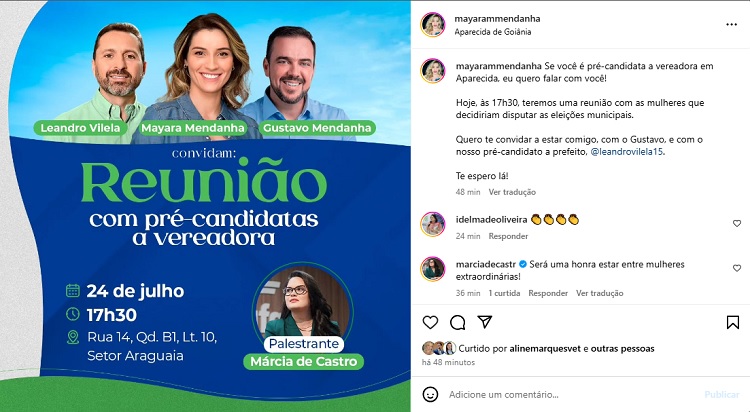 A ex-primeira-dama Mayara Mendanha tem utilizado suas redes sociais para promover o pré-candidato a prefeito do MDB, Leandro Vilela. O detalhe é que a esposa de Gustavo Mendanha (MDB) é filiada ao Partido Liberal (PL), sigla que banca a pré-candidatura de Professor Alcides (PL) no município.
