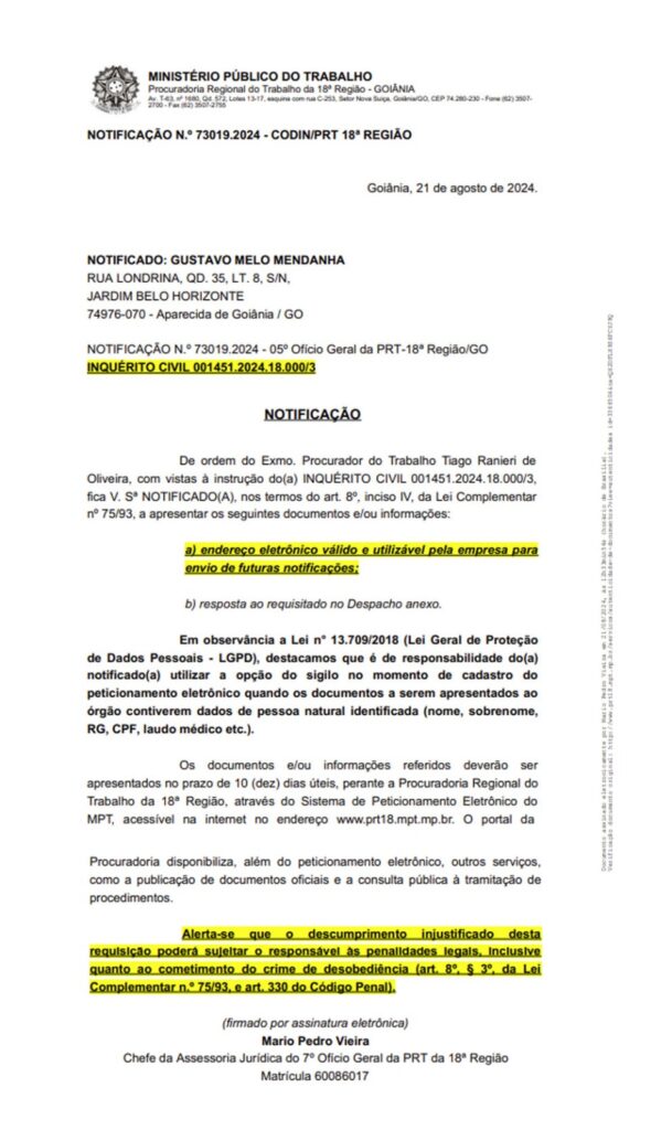 A intimação para fornecimento de informações foi enviada ao candidato e ao ex-prefeito, que deverão apresentar documentos e/ou explicações sobre as ações relacionadas no prazo de 10 dias úteis perante a Procuradoria Regional do Trabalho da 18ª Região.