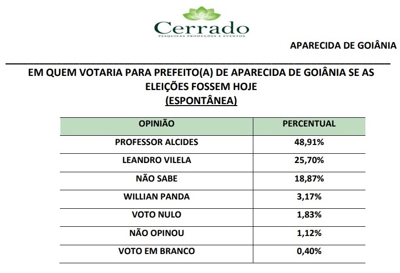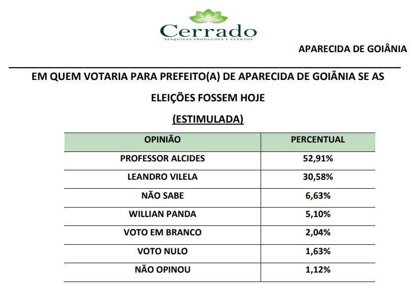 Levantamento realizado pelo instituto Cerrado Pesquisas aponta vitória de Professor Alcides (PL) no primeiro turno. Conforme o instituto, o candidato do PL vence a corrida eleitoral com 59,72% dos votos válidos, quando se elimina os votos brancos e nulos.