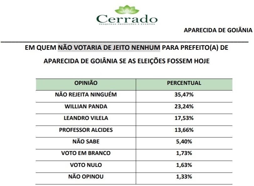 No cenário da rejeição, Panda lidera com 23,24%, seguido por Vilela, com 17,53% e Professor Alcides, com 13,66%. Outros 35,47% não rejeitam ninguém, 5,40% não sabem, os brancos somam 1,73%, nulos representam 1,63% e 1,33% não opinaram.