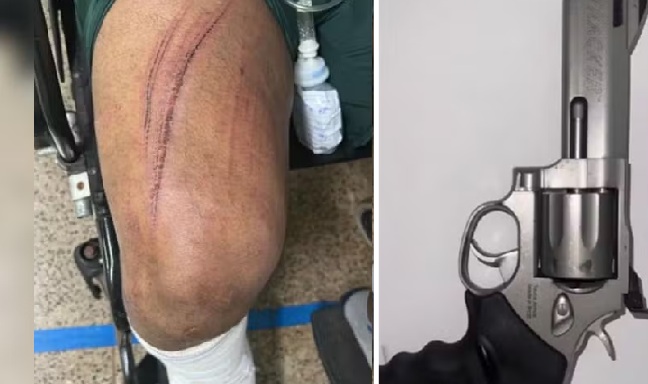 A Polícia Militar foi acionada e durante diligência identificou o casal suspeito. Na residência um homem foi preso em flagrante e também foram apreendidos um revólver calibre 38, um revólver 357 Magnum, sete munições intactas e outras duas munições usadas.