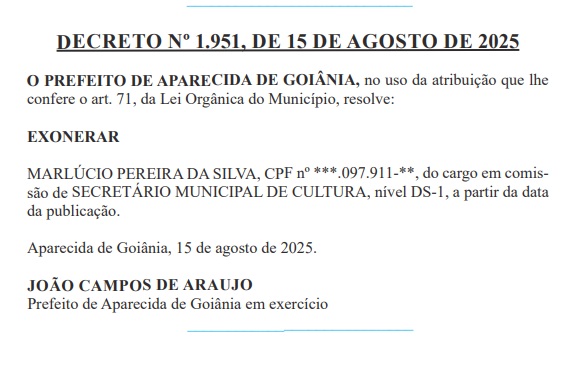 Foi publicado no Diário Oficial Eletrônico (DOE) da prefeitura de Aparecida de Goiânia nesta sexta-feira (15/8) o decreto de exoneração de Marlúcio Pereira da Secretaria Municipal de Cultural.