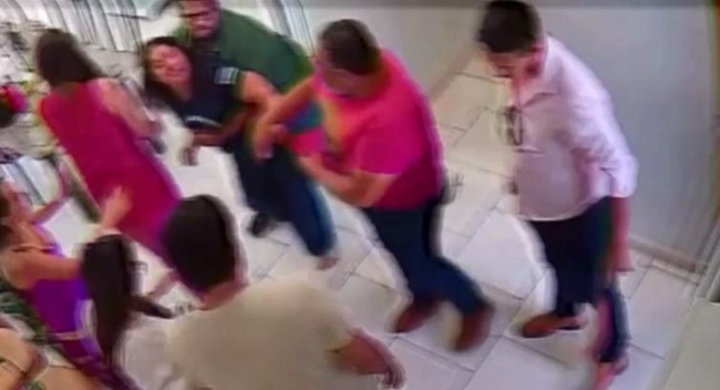 Nas imagens é possível notar que, durante discussão, ela dá um tapa em direção ao rosto do vereador, que se defende. Em seguida ele cai e ela pega na perna dele, até que outras pessoas interferem na situação.