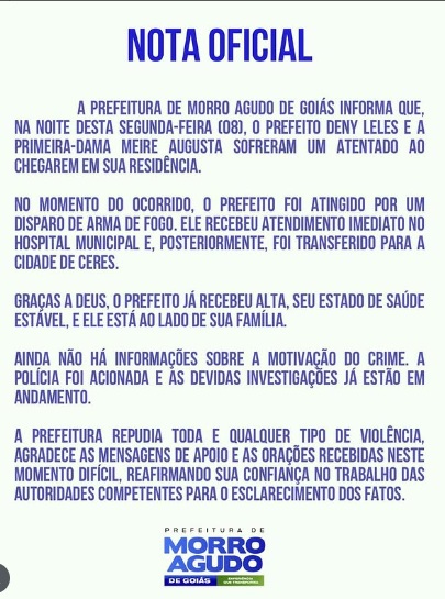 Em nota publicada no Instagram, a prefeitura de Morro Agudo de Goiás informou que o prefeito foi atendido no Hospital Municipal e, depois, foi levado para uma unidade em Ceres, onde teve alta.